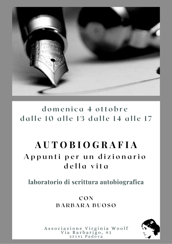 Il nuovo corso intensivo di scrittura autobiografica, promosso dalla Scuola Virginia Woolf in collaborazione con Lìbrati, si sviluppa come percorso autoformativo di scrittura a partire dal proprio materiale biografico, dai ricordi, dalle relazioni e dai luoghi vissuti. In questi quattro appuntamenti ciascun partecipante si dedicherà alla propria storia e alla scrittura del proprio racconto autobiografico in un percorso di ricerca di senso e di indagine psicologica e creativa.