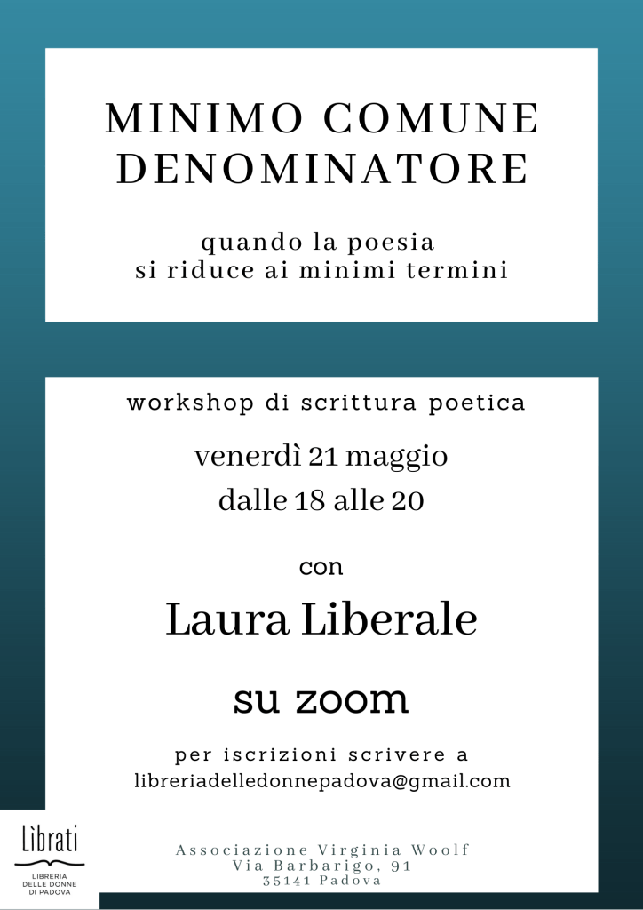 “Minimo comune denominatore: quando la poesia si riduce ai minimi termini” è un workshop di scrittura poetica in cui si rifletterà e si lavorerà sulla brevità e potenza espressiva a partire dai testi di alcune autrici contemporanee (tra cui Mancinelli, Clifton, Koltz, Agustoni).