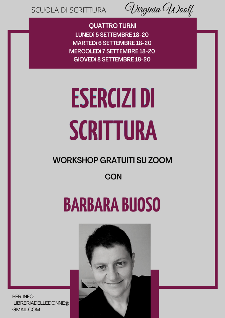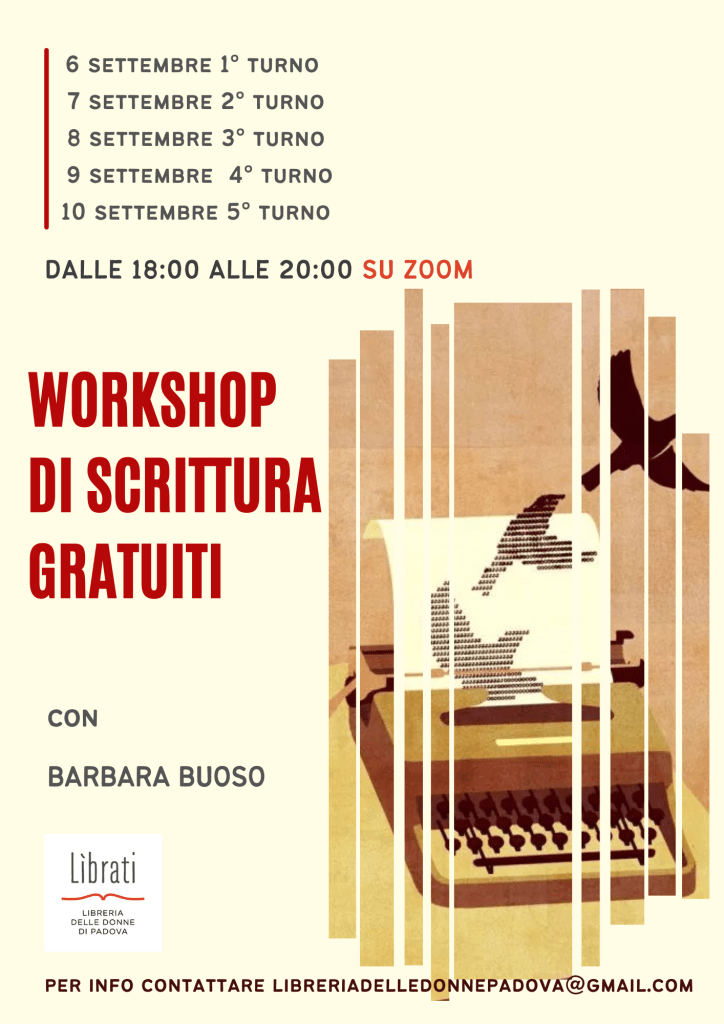 Lìbrati in collaborazione con la Scuola di scrittura Virginia Woolf organizza dei mini workshop gratuiti di scrittura creativa. Ci si può iscrivere ad un singolo workshop che è della durata di 2 ore ed è rivolto a tutte e tutti coloro che sono appassionati di scrittura. Non sono richieste competenze pregresse. L’evento è organizzato per “aprire le porte della nostra scuola” e per conoscerc I posti sono limitati ed è richiesta la prenotazione all’indirizzo libreriadelledonnepadova@gmail.com indicando nella mail a quale dei cinque turni si desidera partecipare. Barbara Buoso nata a Rovigo nel 1972, vive e lavora a Padova. Nel 2003 pubblica il suo romanzo d’esordio Aspettami con Croce Editore. Nel 2014, su segnalazione di Emma Dante, pubblica L’ordine innaturale degli elementi (Baldini & Castoldi). Vincitrice con il racconto “Nevicata” del concorso di racconti “Lìbrati e vola” (pubblicato poi nel 2016 nella raccolta “Soffia un vento contrario”, L’Iguana Editrice). E’ uscito a febbraio 2018 il suo ultimo romanzo “E venni al mondo” (Apogeo editore). Insegna scrittura creativa alla Scuola di scrittura Virginia Woolf.